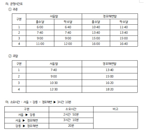 한편 노선은 주중·주말 모두 1일 4회 왕복 노선으로 운영되며, 예상 소요 시간은 3시간 10분이다. 요금은 2만5,200원으로 기존 서울경부-강릉(2만4,600원) 노선에서 600원만 더 지불하면 된다.
