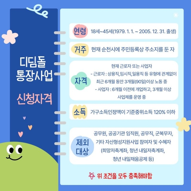 전남 순천시가 '2024년 청년 희망 디딤돌 통장 사업'에 참여할 청년을 2024년 4월 22일부터 오는 5월 3일까지 2주간 모집한다.